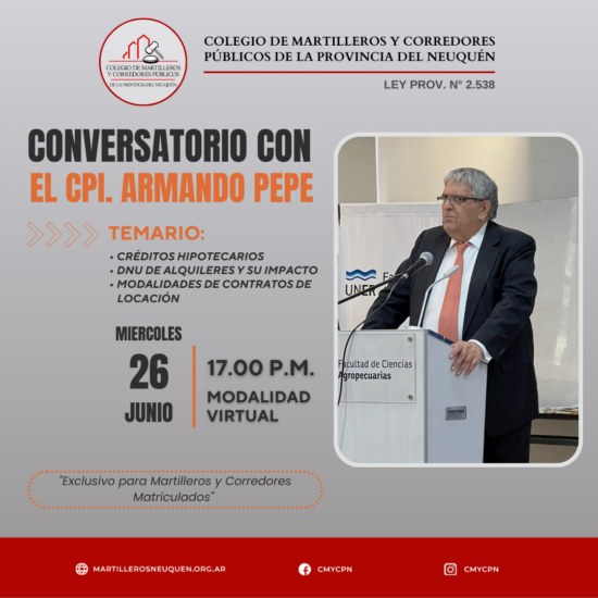 Conversatorio con el CPI. Armando Pepe ✓ Temario: – Créditos Hipotecarios – DNU de Alquileres y su impacto – Modalidades de contratos de locación ✓ Fecha: 26 de Junio de 2024 ✓ Horario: 17:00 hs….