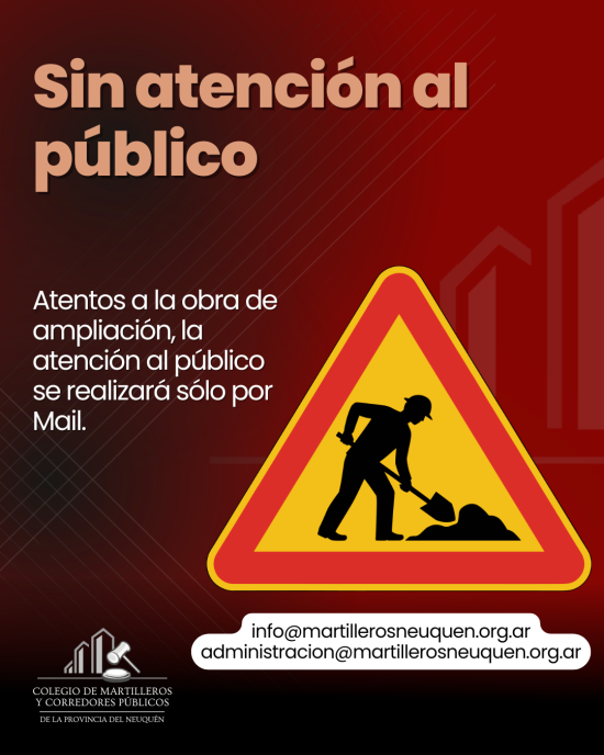 🚫 Sin atención al público por Obra Atentos a la obra de ampliación, estaremos sin atención presencial. Podrán contactarnos por WhatsApp exclusivo para matriculados o por mail. 📩 Mail: info@martillerosneuquen.org.ar administracion@martillerosneuquen.org.ar Un atento saludo!