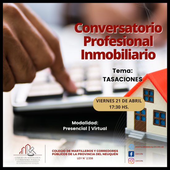 Queremos invitarlos a participar de forma presencial de un nuevo ciclo del Conversatorio Profesional Inmobiliario en el que mantendremos una charla participativa sobre Tasaciones.