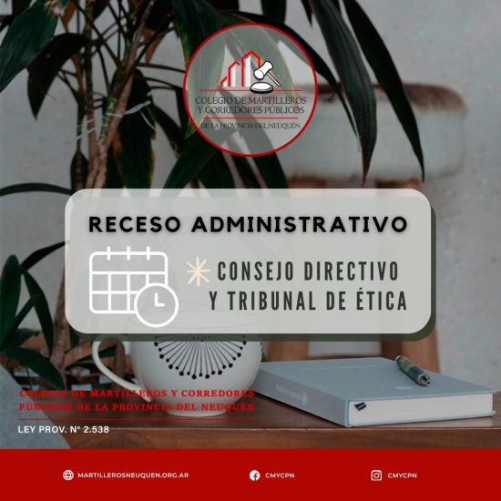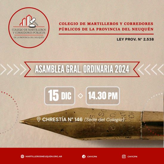 Convocatoria Asamblea General Ordinaria El Consejo Directivo del Colegio de Martilleros y Corredores Públicos de la Provincia del Neuquén convoca a ASAMBLEA GENERAL ORDINARIA para el día 15 de Diciembre de 2023 a las 14:30…