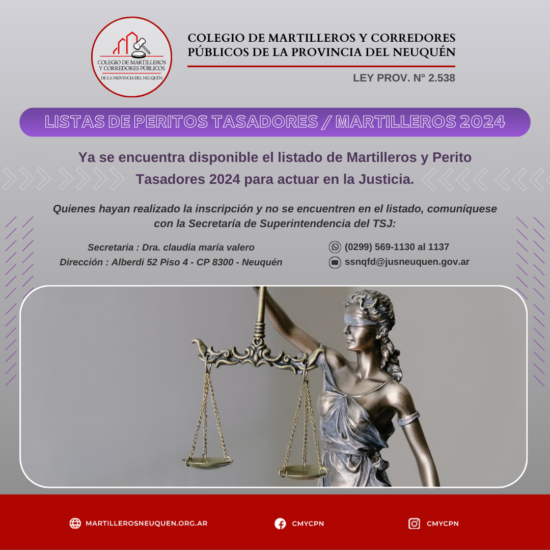 nformamos que ya se encuentra disponible el listado de Martilleros y Perito Tasadores 2024 para actuar en la Justicia. Quienes hayan realizado la inscripción y no se encuentren en el listado, comuníquese con la Secretaría…