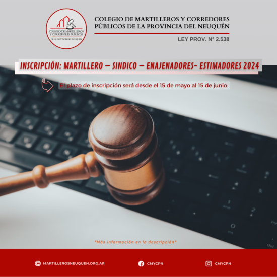 Inscripción: Martillero – Sindico – Enajenadores- Estimadores 2024 Estimados/as: Se encuentra aprobada y habilitada la plataforma web para la inscripción de los aspirantes a MARTILLERO – SINDICO – ENAJENADORES – ESTIMADORES (ley 24522), con una…