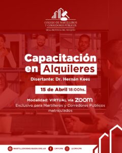 ▫️ Capacitación – Alquileres ** Exclusivo para Martilleros y Corredores Públicos matriculados ** Fecha: 15 de abril 2025 Horario: 18:00 – 20:30hs. Modalidad: Virtual – Zoom Disertante: Dr. Hernán Milton Kees 👉🏽Toda la información de valores e INSCRIPCIÓN la podes encontrar en la bandeja de entrada del Sistema de Notificaciones Electrónicas del Colegio. Si todavía no generaste el alta al Sistema de Notificaciones Electrónicas, envianos