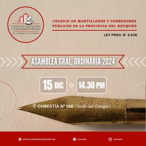 Convocatoria Asamblea General Ordinaria El Consejo Directivo del Colegio de Martilleros y Corredores Públicos de la Provincia del Neuquén convoca a ASAMBLEA GENERAL ORDINARIA para el día 15 de Diciembre de 2023 a las 14:30 hs., en la Sede del Colegio, sito en Chrestia N° 146 de la ciudad de Neuquén, a los efectos de tratar el siguiente ORDEN DEL DIA:• Designación de dos matriculados