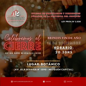 El día Viernes 15 de Diciembre a las 20:30 hs. tenemos una cita! Realizaremos un Brindis para festejar y cerrar nuestro año. Contaremos con un hermoso espacio al aire libre, servicio de lunch, cocteles y lo mejor de la noche; la compañía de cada uno/a de Uds. Será una maravillosa noche y queremos compartirla con todos nuestros colegiados! 🟡 Fecha y horario: 15 de Diciembre